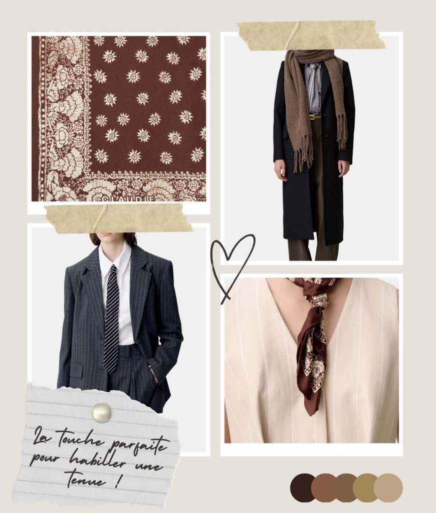 Quitte à avoir chaud, autant le faire de façon stylé ! Coup de cœur pour le bandana revisité qui revient sur le devant de la scène. Porté façon foulard noué serré, glissé sous un pull ou attaché à l’anse d’un sac, il donne une allure subtilement western ou bohème selon l’imprimé choisi. Claudie Pierlot propose des pépites avec différents motifs et couleurs. La maxi écharpe à franges s’impose cette année encore comme l’alliée incontournable des températures glaciales. On l’a choisi oversize, enveloppante, presque plaid pour qu’elle structure la silhouette et ajoute du volume. Vous pouvez aussi la choisir colorée pour égayer la grisaille ambiante ! Plus audacieuse, la cravate pour les femmes s’affirme comme une tendance forte. Chipée dans le vestiaire masculin, elle apporte une touche chic ultra mode.
