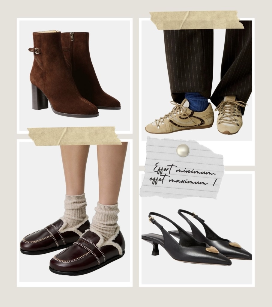 Les chaussures de cet hiver jouent la carte du confort sans jamais sacrifier le style. Je suis une grande fan des bottes en croûte qui sont incontournables. Encore un clin d’œil à l’esthétique western sur lequel on surfé depuis deux ans déjà. Elles se marient parfaitement avec des robes longues, des jupes midi ou un jean flare. Les baskets années 90 reviennent en force. Leur apparence légèrement rétro apporte un twist casual à des tenues plus sophistiquées. Portées avec un manteau long, elles créent ce contraste décontracté qu’on adore. Pour les journées les plus froides, les mules fourrées restent une valeur sûre. À mi-chemin entre confort et tendance, elles permettent de rester stylée même dans un look cosy. Enfin, les chaussures à mini talons feront craquer celles qui veulent de la féminité avec encore une fois, un petit côté rétro. Délicates, élégantes, elles allongent la silhouette tout en restant faciles à porter au quotidien.